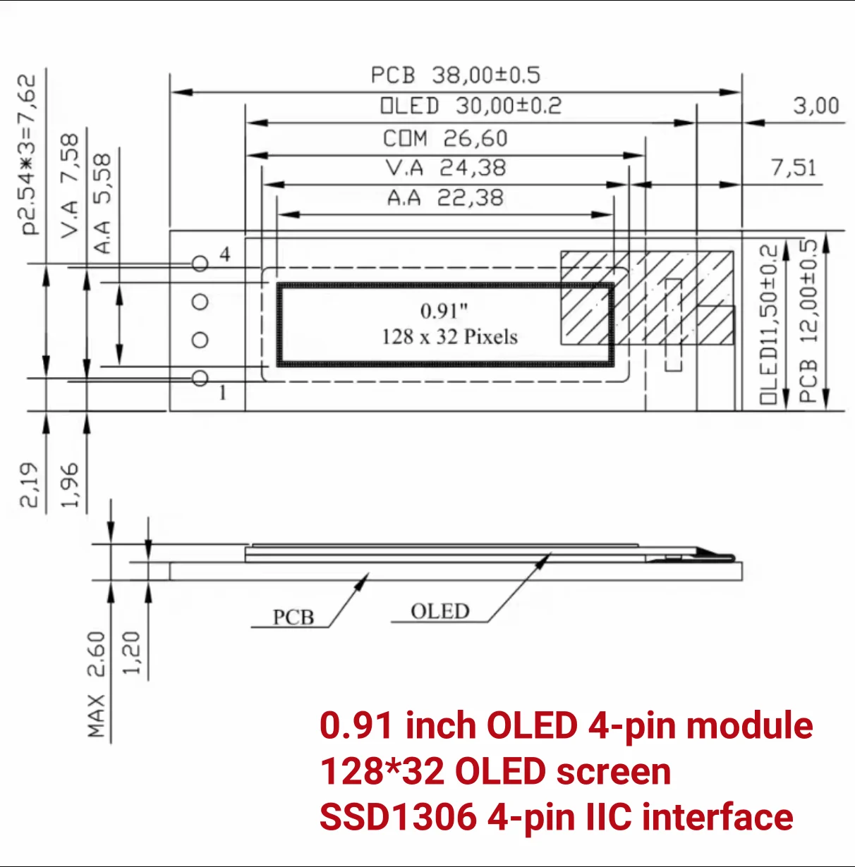 Size: 0.91 inch module Product model: M091-12832-4 (white letters) Resolution:128×32 Display area size (mm):22.384×5.584 Viewing area(mm):24.384×7.584 Panel size (mm):30.0×11.50×1.227 color: White Working temperature: -20~70℃ Driver IC: SSD1306 Interface: IIC Installation: Connector
